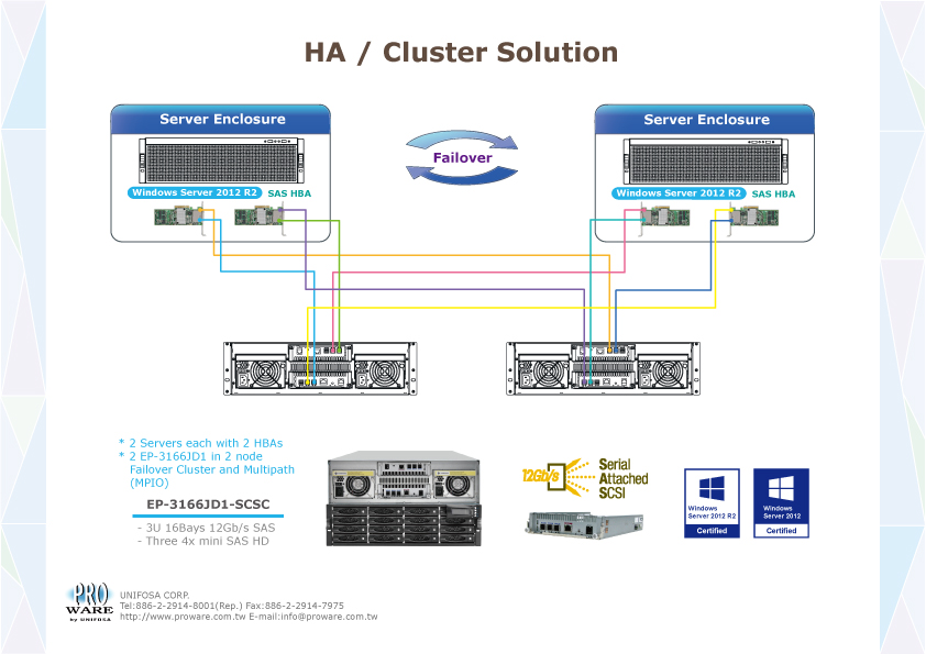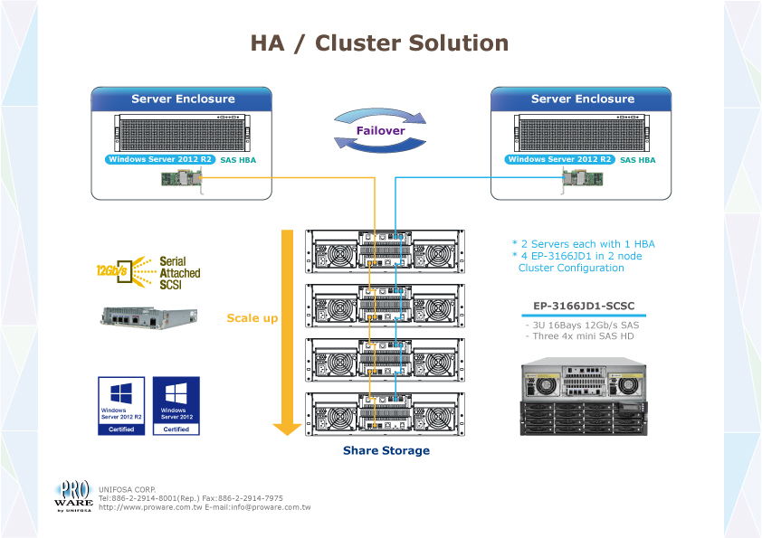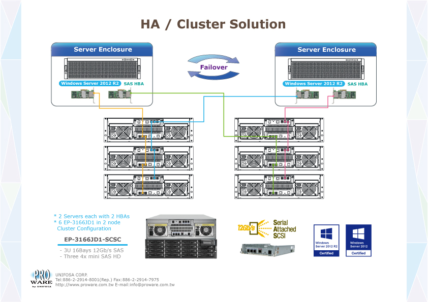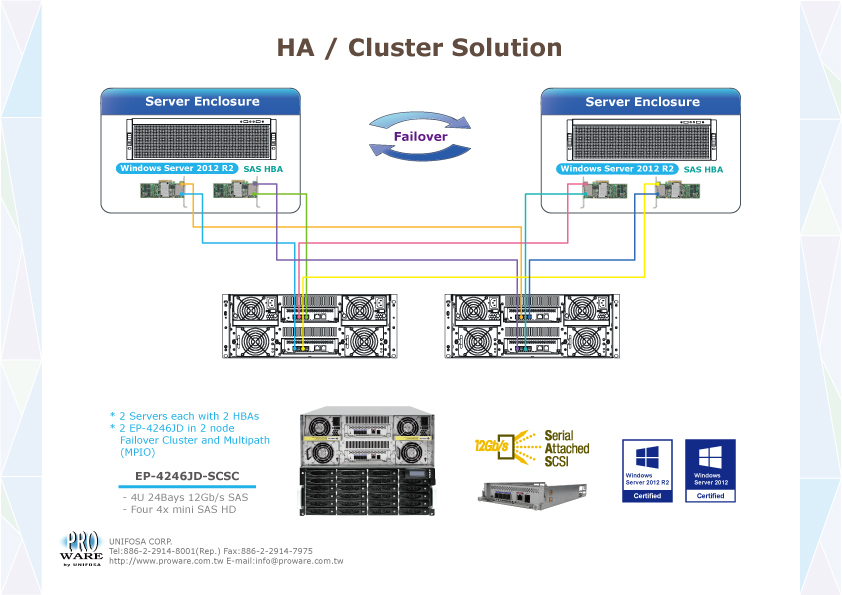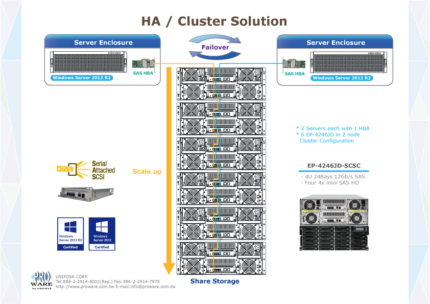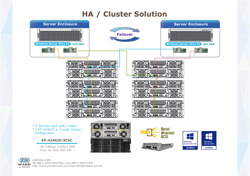 The 12Gb SAS JBOD series accommodates the latest SAS 3.0 12Gb/s interface which boost up the throughput up to 4,800MB/s per host. Based on this powerful performance, 12Gb SAS JBOD series can efficiently meet demands for Windows Server 2012 projects.
