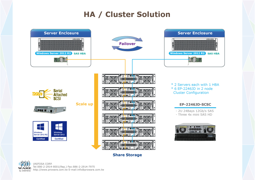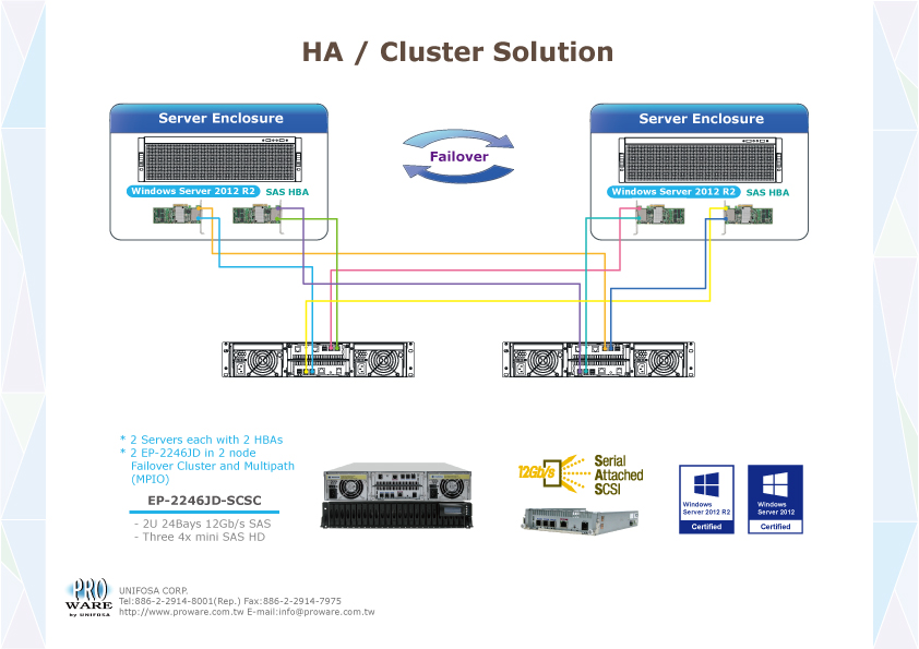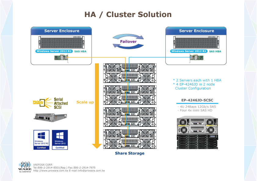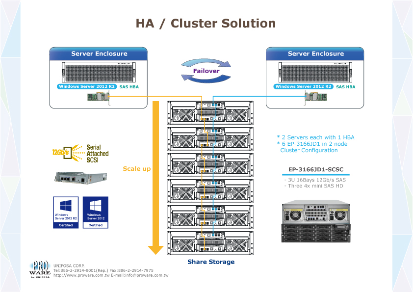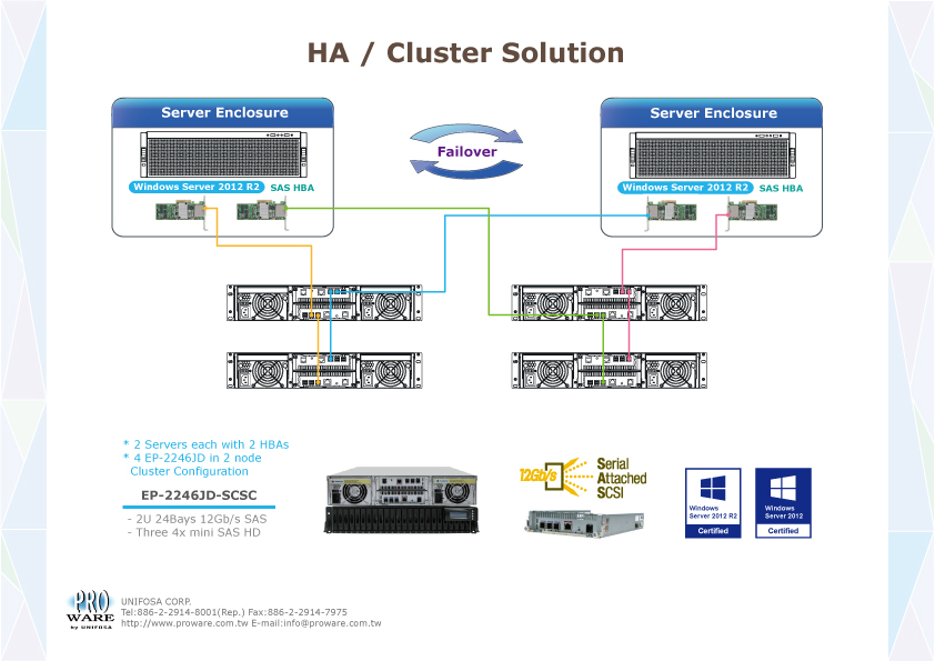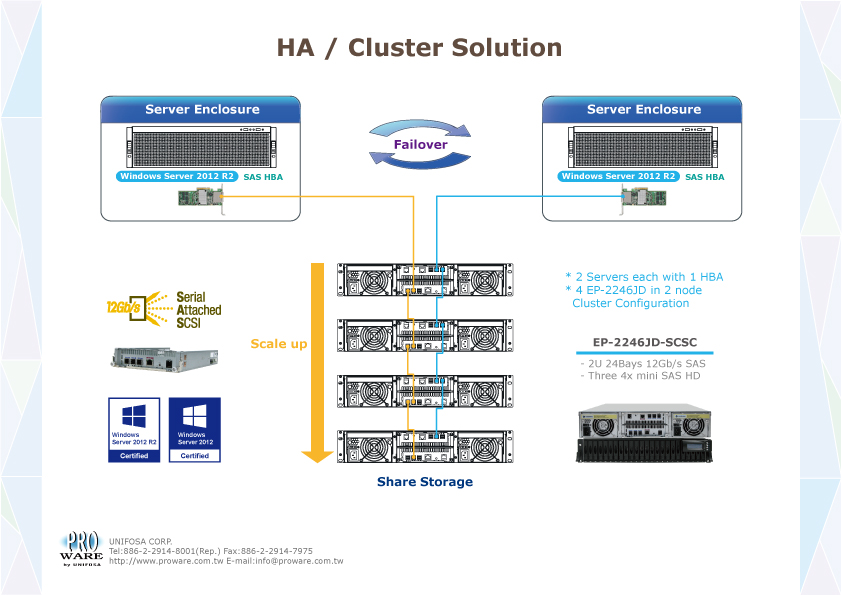 The 12Gb SAS JBOD series accommodates the latest SAS 3.0 12Gb/s interface which boost up the throughput up to 4,800MB/s per host. Based on this powerful performance, 12Gb SAS JBOD series can efficiently meet demands for Windows Server 2012 projects.