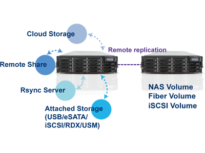 Data backup and remote real-time replication Complete backup solution, including full, differential, and incremental two-way backup via attached storage (USB/eSATA/iSCSI/RDX/USM), or to remote share, Rsync server, and cloud storage.